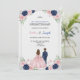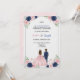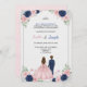 A floral-themed invitation with a couple facing away, the woman in a pink dress and the man in a blue suit. Text details an event for Sophia and Joseph