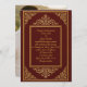 Este diseño es una obra maestra de la elegancia y la personalización. La fachada de la invitación está adornada con un fondo rojo real y profundo, acentuado por un filigrí grabado en relieve dorado que se desliza en forma de cuadros intrincados, evocando un lujo atemporal. Los bordes ordenados enmarcan el espacio reservado para el texto, asegurando que cada detalle se sienta refinado. En la parte posterior, la invitación incluye una sección de fotos de personalizable, perfectamente integrada en el diseño. Este espacio permite un toque personal, ya sea un retrato de compromiso o una instantánea romántica, realzando el valor sentimental de la pieza. Los acentos dorados y el delicado filigree embellecen los bordes, creando una estética cohesiva y regal que equilibra la sofisticación con la calidez. El efecto general es una impresionante mezcla de tonos ricos, texturas elegantes y personalización a medida, lo que lo convierte en una elección perfecta para una invitación de boda verdaderamente inolvidable.