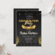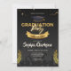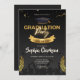 Una invitación simple y clásica con gorra de graduación, confetti y laurel de oro sobre fondo negro