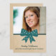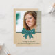Invitación a la graduación de Cute Bow dulce y encantadora con un llamativo arco de polka punto turquesa y un fondo de textura de papel falso. Perfecto para anunciar sus noticias de graduación e invitar a amigos y familiares a celebrar el logro. Fácil de personalizar, simplemente agregue una foto y los detalles de su fiesta en los campos de texto proporcionados.