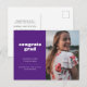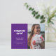 Anuncie el gran logro de su graduado con esta simple pero elegante invitación de graduación e invitación. Presenta las palabras "felicitaciones grad" en un tipo de letra blanco retro en un fondo morado así como espacio para una foto en el frente. Usa la parte trasera de la tarjeta para más detalles sobre la celebración de tu graduado.