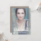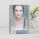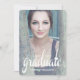 Un diseño moderno sencillo y encantador que presenta la foto de su graduado en la parte delantera con todos los detalles del fiesta o la invitación en la parte trasera sobre un suave fondo marrón neutro. Diseño caprichoso de tipografía cursiva blanca con un toque femenino dice "graduado" en formato vertical. Una manera contemporánea y hermosa de destacar la celebración de la graduación de tu hija.