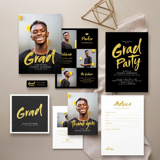 Invitación de graduación con foto en negro y oro, simple y única. Personalizado con tus propias fotos e información de fiestas de grado.