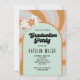 ¡Invitación a la graduación fotográfica de los años 70! Las líneas de la escalera de la paz, de ráfagas de sol rápidas, en colores neutros con flores gruesas y las palabras "Paz fuera" con letras retro. Añade la foto de tu graduado al frente y la información de la fiesta de graduación al dorso.