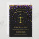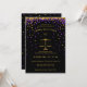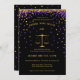 Invitación a graduación de la Facultad de Derecho con confetti color púrpura y purpurina dorado y símbolo de la escala de oro de la justicia. Personaliza el texto para tu propia ceremonia de graduación! Nota: El purpurina de oro es un efecto impreso, no se usará ningún purpurina real para hacer estas invitaciones.