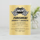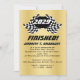 ¡Terminado, hecho, graduado! Banderas de cuadros de la invitación de carreras en oro, negro y blanco para tu estudiante de secundaria que ha llegado a la meta!