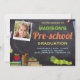Sorprenda a sus huéspedes con esta encantadora invitación para graduación preescolar que incluye elementos bonitos con una tipografía vibrante sobre un fondo de pizarra. Simplemente agregue los detalles de su evento en esta plantilla fácil de usar y adorne esta tarjeta con la foto favorita de su hijo para convertirla en una invitación única. Girar la tarjeta para mostrar un patrón de franjas coloridas en la parte posterior de la tarjeta.