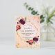 Al frente: Una invitación para una fiesta de 50 años, 50 años (o de cualquier edad) de cumpleaños. Un fondo oscuro de color rosa rosado, dorado subió, con un marco geométrico falso dorado. Decorado con flores moradas oscuras y borgoñonas, rosas y plumas de estilo boho. Estrellas de oro falsas goteando. Personalice y agregue un nombre y detalles del fiesta. El nombre está escrito con un guión de estilo con letras a mano, letras de color negro. Atrás: Diseño de postales. oro Rosa, fondo de color rosa gradiente de color rosa y estrellas doradas. Sugerencia: Si no desea que se vea como una postal, haga clic en personalizar, vaya a la parte posterior y quite el separador y el sello postal.