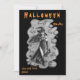Halloween, un ilustracion fresco con una bella bruja y su muñeca rodeados por un marco adornado con calabaza. Colores: blanco y negro. El dibujo original fue hecho con lápices por el artista © E. D. Siffert.