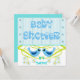 Invitación-Invitación de Baby Shower. Invita a tu familia, parientes y amigos a tu fiesta de ducha de bebé con esta encantadora invitación que incluye dos adorables birdies azules en una rama de cal con flores azules. Las palabras que Baby Shower está escrito en un precioso tipo de letra azul con corazones con fondo de rayas azules.