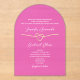 Una invitación a una boda acrílica audaz y moderna en un vibrante rosa caliente, con una elegante tipografía en blanco y oro con un motivo de corazón y cinta de correr. La forma de arco y el material acrílico translúcido ofrecen un ambiente elegante y de alta gama que crea una impresión duradera. Perfecto para celebraciones glamorosas, de moda o bodas de destino, esta invitación combina un color de tendencia con texturas de lujo. Personalizar todo el texto para tu evento y cuida a tus invitados con una moda, presentación moderna.