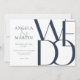 Las invitaciones a bodas simples pero audaces de 7" x 5" incluyen las palabras "Lo hacemos", en letras azul marino sobredimensionadas sobre un fondo neutral con marina y un texto editable en gris claro para los nombres de la pareja boda, fecha, hora, lugar, dirección del lugar con el mensaje abajo, "recepción a seguir".