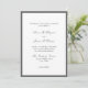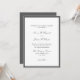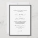 Elegante invitación de boda con escritura clásica y texto plano. Introducción general: el placer de su empresa se solicita al boda de. Texto negro sobre un fondo blanco dentro de un borde gris oscuro. La espalda está gris.