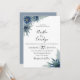 Flores y hojas de color azul azul, invitación a la boda botánica. texto personalizar, estilo de fuente, color y tamaño. También se puede editar el color de los respaldos que se muestra en azul polvoriento.