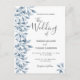 Una invitación de bodas a la moda en blanco y azul polvoriento. Un fondo blanco de moda en la parte delantera. Decorado con estribos botánicos de color azul y follaje. Guión moderno de gran tamaño con letra, tipografía con el texto: El boda de. Plantillas para nombres y detalles del boda. Texto gris oscuro. Fondo azul polvoriento. Sugerencia: Si no desea que se vea como una postal, haga clic en personalizar, vaya a la parte posterior y quite el separador y el sello postal.