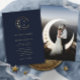 Bienvenidos al cautivador reino de la "Invitación a la Boda Celestial de la Luna de Oro", una exquisita carta meticulosamente hecha para sumergir a tu boda en un ambiente etéreo y encantador. Esta invitación no es solamente un pedazo de papel, es un portal para una historia de amor celestial, donde cada detalle resuena con la promesa de un eterno romance. El lienzo empieza con un tranquilo fondo azul que recuerda al amplio cielo sin límites. Este tono apacible es el telón de fondo perfecto, evocando una sensación de serenidad y profundidad que refleja la profunda conexión compartida entre dos almas a punto de embarcarse en su viaje celeste. En el corazón del diseño, una luna de oro toma el centro del escenario, proyectando un cálido resplandor que simboliza el amor y el compromiso duraderos entre los compañeros. Esta luna de oro, enclavada contra el lienzo azul, se convierte en un faro celestial, que guía a las parejas hacia una unión que trasciende a la ordinaria. Añadiendo un toque de mística y delicadas fases de la luna se tejen perfectamente en el diseño. Estas fases no sólo contribuyen a la estética general sino que también simbolizan la naturaleza cíclica del amor, un recordatorio de que el viaje conjunto es tan dinámico y hermoso como los rostros cambiantes de la luna. Al adoptar la era moderna, la "invitación a la boda celestial azul" integra perfectamente elementos de invitación a la boda digital. Esta inclusión añade un toque contemporáneo, un guiño a la evolución del paisaje de historias de amor, donde la tradición se encuentra con la innovación en una mezcla armoniosa. Para un toque personalizado, las originales iniciales de personalizable de la pareja están elegantemente colocadas, añadiendo un elemento minimalista pero sofisticado al diseño. Además, la parte posterior de la tarjeta ofrece una opción para una foto de personalizable de la pareja, permitiéndoles añadir un toque personal a su invitación. En resumen, la "Invitación a la Boda Celestial de la Luna de Oro" es una obra maestra celeste que combina la tranquilidad de un fondo azul con la presencia regular de una luna creciente de oro, estrellas, fases lunares y iniciales elegantemente simples. Esta invitación promete cautivar a las parejas que buscan un toque único, elegante y minimalista para su celebración boda —una oda celestial al amor que trasciende las fronteras comunes e invita a las parejas a emprender juntos un mágico viaje cósmico.