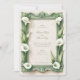 Esta exquisita invitación a la boda desprende elegancia clásica, con su retrato acuarela de lirios de calila en un entorno de vegetación ornamental de inspiración vintage. El encanto atemporal de la calla, conocida por sus líneas depuradas y sus elegantes curvas, se complementa perfectamente con los detalles del marco barroco en tonos salvia y oliva. La parte delantera de la invitación ofrece un espacio majestuoso para los nombres de la pareja, mientras que la parte trasera ofrece una invitación completa al evento, dentro de la sofisticada frontera. Este diseño es un homenaje al dulce arte de las épocas pasadas, ideal para un boda que intenta mezclar lo tradicional con lo botánico.