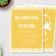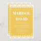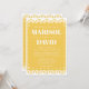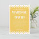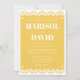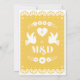 Una hermosa invitación a una boda a la manera de un picado, en un fondo amarillo festivo. En la parte trasera hay una paloma con las iniciales de la pareja. Perfecto para un boda mexicano tradicional o moderno.