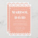 Una hermosa invitación a una boda a la manera de un picado, de fondo rosa y lujoso. En la parte trasera hay una paloma con las iniciales de la pareja. Perfecto para un boda mexicano tradicional o moderno.