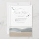 Invite a los huéspedes a su celebración junto al mar con esta invitación matrimonial, que incluye una escena ilustrada de playa adornada con dos elegantes gaviotas. En la parte trasera se exhiben las clásicas rayas náuticas en suaves tonos azulados-grises, lo que evoca la tranquilidad de un romanticismo costero.
