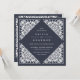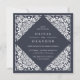 Elegantes invitaciones de bodas vintage en el azul de medianoche, presentan un adornado borde deco detallado que evoca el aspecto de papel cortado en un estilo de papel picado. Forma cuadrada.