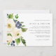 Nuestra invitación a la boda de Blueberry Lane incluye los detalles de su boda alineados a la derecha, acentuados por flores color azul índigo y marfil, arándanos y follaje verde.