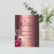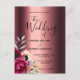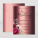 Delante: Una invitación de boda moderna y elegante. Un falso fondo metálico de cobre. Decorada con flores moradas oscuras, borgoñonas y rosa rosa. Plantillas para nombres, fecha y lugar del boda. El texto: El Boda de está escrito con una gran escritura a mano con letras de estilo, letras de color negro. Retroceso: fondo falso de aspecto metálico de cobre.