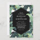 Glamorosas hojas de plátano adornan esta moderna invitación a la boda. Un elemento geométrico de moda y un frondoso follaje tropical se prestan a un ambiente de diseño. Introduzca nuestra tienda para coordinar artículos: