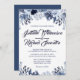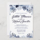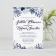 Diseño floral romántico y elegante de color azul índigo. Los tonos azules comienzan con el azul índigo más profundo y se pasa al azul pálido más claro. Una paleta de colores muy sofisticada. El fondo de la parte delantera es blanco crujiente. La inscripción sigue el mismo degradado de color azul. Los nombres de las parejas bodas están en azul índigo. El resto del texto está en gris azul claro. El fondo de la invitación a la boda es azul índigo profundo, con un ramo de flores azul claro y los nombres de las parejas de novias con un azul gris claro.