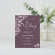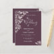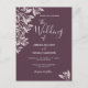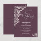 Una invitación botánica de bodas a la moda en casis, morado profundo. Decorada con follaje polvoriento de color rosa y brotes. Escritura moderna con letras a mano, tipografía con el texto: El boda de. Plantillas para sus nombres y detalles del boda. Texto blanco. Parte posterior: fondo de color cassis. Sugerencia: Si no desea que se vea como una postal, haga clic en personalizar, vaya a la parte posterior y quite el separador y el sello postal.