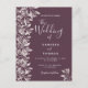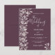 Una invitación botánica de bodas a la moda en casis, morado profundo. Decorada con follaje polvoriento de color rosa y brotes. Escritura moderna con letras a mano, tipografía con el texto: El boda de. Plantillas para sus nombres y detalles del boda. Texto blanco. Parte posterior: fondo de color cassis. Sugerencia: Si no desea que se vea como una postal, haga clic en personalizar, vaya a la parte posterior y quite el separador y el sello postal.