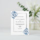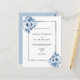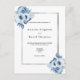 Delante: Un fondo blanco de moda clásico con un marco de imitación de plata. Decorado con flores de color acuático, florales en tonos azules. Plantillas para los nombres de la novia y del novio y detalles del fiesta. El texto está escrito con letras de color negro. Fondo azul polvoriento. Sugerencia: Si no desea que se vea como una postal, haga clic en personalizar, vaya a la parte posterior y quite el separador y el sello postal.