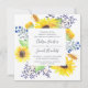 Nuestra invitación a la boda Flowerfields en un formato cuadrado único enmarca tus detalles bodas con girasoles acuáticos amarillos, hojas verdes exuberantes y brotes morados y azules. Una hermosa elección para bodas rústicas de verano o otoño en ambientes rurales o al aire libre.