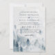 Elegante invitación a bodas de invierno con un fondo de acuarela que representa un paisaje montañoso nevado salpicado de pinos en tonos brumosos de azul y gris. Personalice los detalles de su boda en moda con letras blandas y sin negro. Una hermosa elección para elegantes bodas de invierno en ambientes montañosos o forestales.