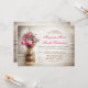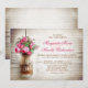 hermosas invitaciones de boda rústicas con fondo de madera angustiada y tarro de albañil con flores rosas. Sugiero un hermoso papel de tela para este diseño.