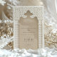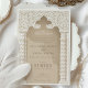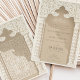 Esta impresionante invitación a la boda se inspira en la rica tradición de la arquitectura islámica, mostrando un diseño de arco palaciego, flanqueado con elegancia por columnas con motivos de chevron en una paleta matizada de crema, taupe y crudo. El intrincado detalle de encaje sobre el arco, representado en tonos de arena y marfil, añade una capa de sofisticación, invocando la belleza intemporal de las intrincadas obras de yeso que se encuentran en las mezquitas históricas. Esta invitación es el epítome de la elegancia y el patrimonio, invitando amablemente a sus huéspedes con su mezcla de arte cultural y elementos de diseño moderno, sentando las bases para un boda que celebra el amor y la tradición.