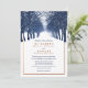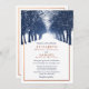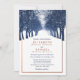 Personalizar esta encantadora y moderna Invitación a la Boda de Invierno con una imagen original de la avenida Navy Blue Winter Trees diseñada con un marco falso de cobre y una combinación de colores blancos. Tenga en cuenta que el cobre es una impresión a color y no es un Relieve metalizado metálico. Esta versión tiene el nombre de texto en color cobre.