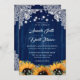 Elegantes invitaciones de boda rústicas de color azul marino inspiradas en encajes florales blancos y luces de cuerda sobre un fondo de madera de granero azul. Diseño perfecto para invitar a sus invitados a su romántica fiesta de bodas rústica azul marino. Plantilla de personalizable completo. Elementos coincidentes disponibles.