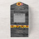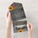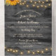 Simplifique la planificación de su boda con esta rústica invitación a tomar el sol, combinando elegancia y comodidad en una pieza muy bien diseñada. Con un fondo de madera oscura de granero, luces de cuerda brillantes, acentos florales de encaje y girasoles audaces con flores de borgoña, este diseño plegable incluye tanto la invitación como la tarjeta RSVP en uno. Perfecto para bodas de campo, establos o ceremonias de otoño, está totalmente en personalizable con sus nombres, fecha y detalles. Una opción encantadora para las parejas que buscan un toque rústico y refinado.