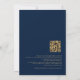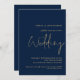 Clásico QR código Navy Blue Gold Typography Invitation. Añada su código QR a su sitio web boda en la parte posterior, lo que hace que sea una opción conveniente para sus invitados a RSVP y vea todos los detalles sin necesidad de tarjetas de detalles y RSVP separadas. Estilo tipográfico minimalista, con un guión escrito a mano para Boda y el resto del texto que se puede personalizar fácilmente.