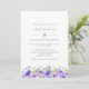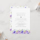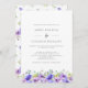 Invitación a una boda de bonito con un borde inferior de flores violetas de color agua y hojas verdes. El reverso presenta un patrón de flores violetas.