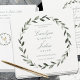 Una corona de hojas de oliva minimalista con una fuente clásica boda para sus nombres y detalles.
