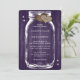Invitación a una boda púrpura rústica con un frasco de albañil y corazones de burrega sobre un fondo de madera de granero.