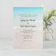 Plantilla de invitación a boda de dolares de arena. El agua tropical azul del mar y la arena de la playa son el telón de fondo con dos grandes imágenes de dólares de arena. El texto impreso en negro es fácil de personalizar para tu evento en tres lugares. Revertir contiene la misma imagen de fondo. La mayoría de los tamaños funcionarán para este diseño, con actualizaciones opcionales de papel y formas de borde.