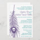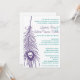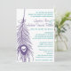 Invitación a la boda con plumas de pavo morado y escritura turquesa, hay un RSVP para coincidir