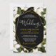 Invernadero floral con flores de poinsettia blanca, hojas verdes y bayas doradas, una elegante invitación a la boda con temática Navidad.
