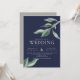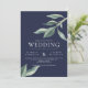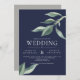 Una impresionante invitación a la boda para parejas que buscan un aspecto moderno y limpio, con hojas color verde agua sobre fondo marino y un estilo moderno de letra blanco. El respaldo está en gris sólido, pero se puede quitar.