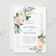 Rubor Bloom Wedding Invitation presenta flores acuarelas pintadas en un follaje rosa, blanco y verde con marcos dorados. Para una personalización más avanzada de este diseño, pulse el botón "Personalizar". También están disponibles los elementos coincidentes.