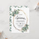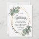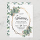 Esta es una hermosa invitación a la boda con diseño de marco geométrico de oro y eucalipto. Se incluye un patrón de fondo coincidente con hojas de eucalipto.