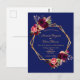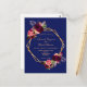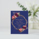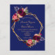 Delante: Una invitación de bodas moderna y de moda. Un fondo azul marino con un marco geométrico falso dorado. Decorada con flores oscuras de color burdeos y rosa, rosas y plumas de estilo boho. Plantillas para los nombres y detalles del boda. Los nombres están escritos con un guión de estilo con letras a mano, letras de colores dorados. Fondo blanco.